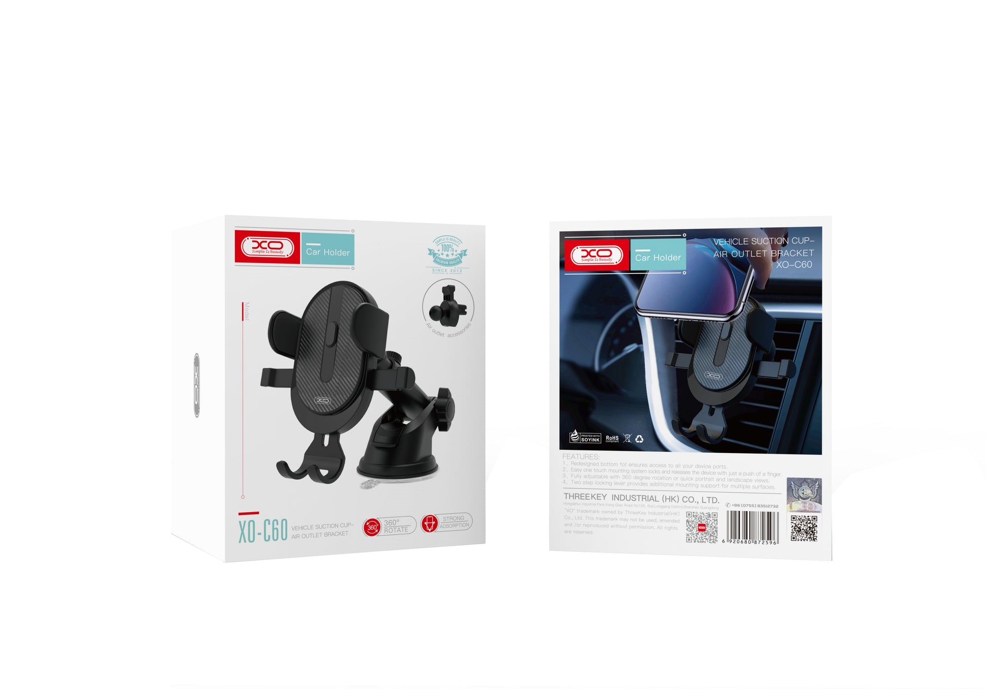 Nosač XO Design C60 je univerzalan model 2u1, koji se može montirati i na ventilacionu rešetku i na vetrobran ili tablu zahvaljujući uključenoj vakumskoj čaši.
